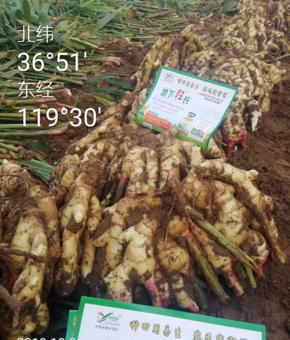 2019年10月21日,回訪(fǎng)噴施六遍的大姜,姜的大片小片都明顯胖,地面都咧著(zhù)縫隙,姜絲密度大,口感不亞老黃姜,緊實(shí)度高,色澤好。